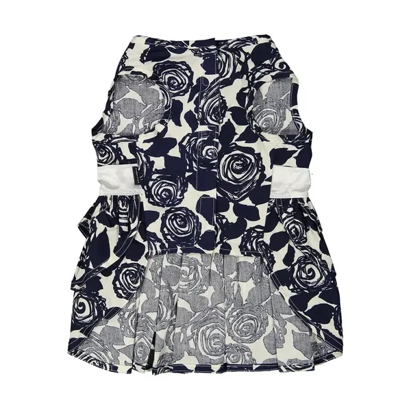 DoggyDolly D379 (43) Hundekleid mit Blumen stilvoll, klassischmit Fliege, grau gestreift